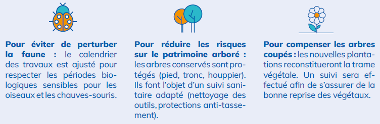 - Réduire les risques sur le patrimoine arboré, avec la venue d’un écologue en amont de chaque intervention sur l’environnement, et la mise en place d’un suivi sanitaire. Des protections sont également installées autour des arbres conservés (pieds, troncs, houppiers).