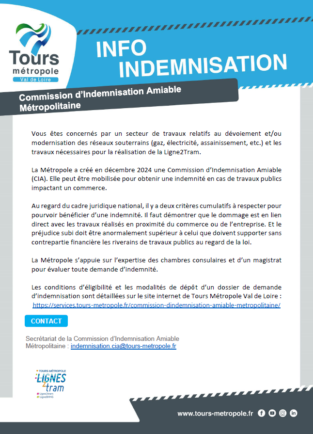 Lors des travaux de réalisation et d’aménagements de la plateforme de la ligne 2 de tramway (à partir de 2026), une commission d’indemnisation à l’amiable sera mise en place par le Syndicat des Mobilités de Touraine (SMT), maitre d’ouvrage du projet Lignes2tram, pour les commerçants riverains.